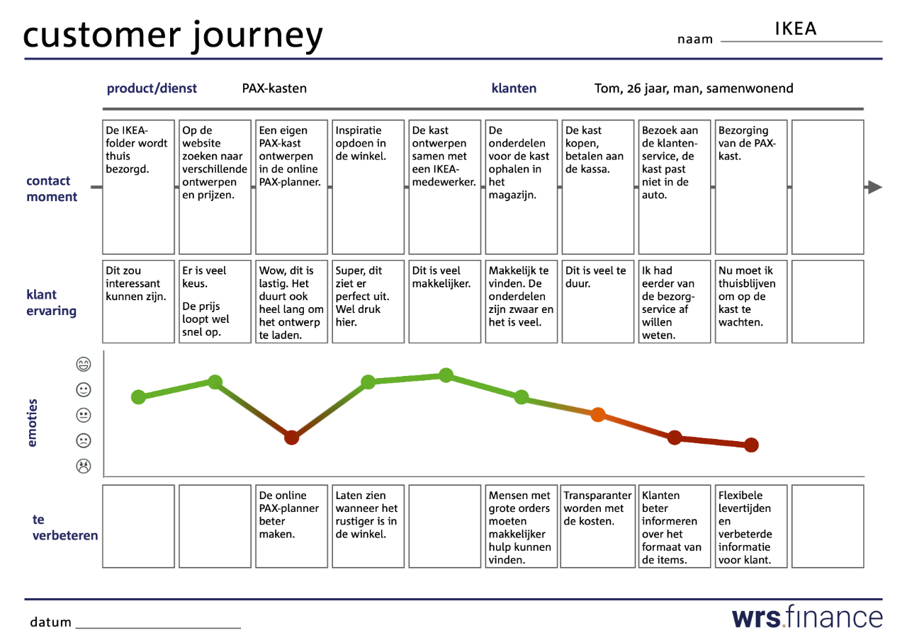 Selecteer een product of dienst waar je de Customer Journey voor wilt maken en beschrijf deze in de template. Kies de specifieke doelgroep waarvoor je de Customer Journey maakt. Wees zo specifiek mogelijk, dit helpt je om je beter te verplaatsen in de positie van die klantgroep en zo een accurater inschatting van diens gedachtes en gevoelens te maken.