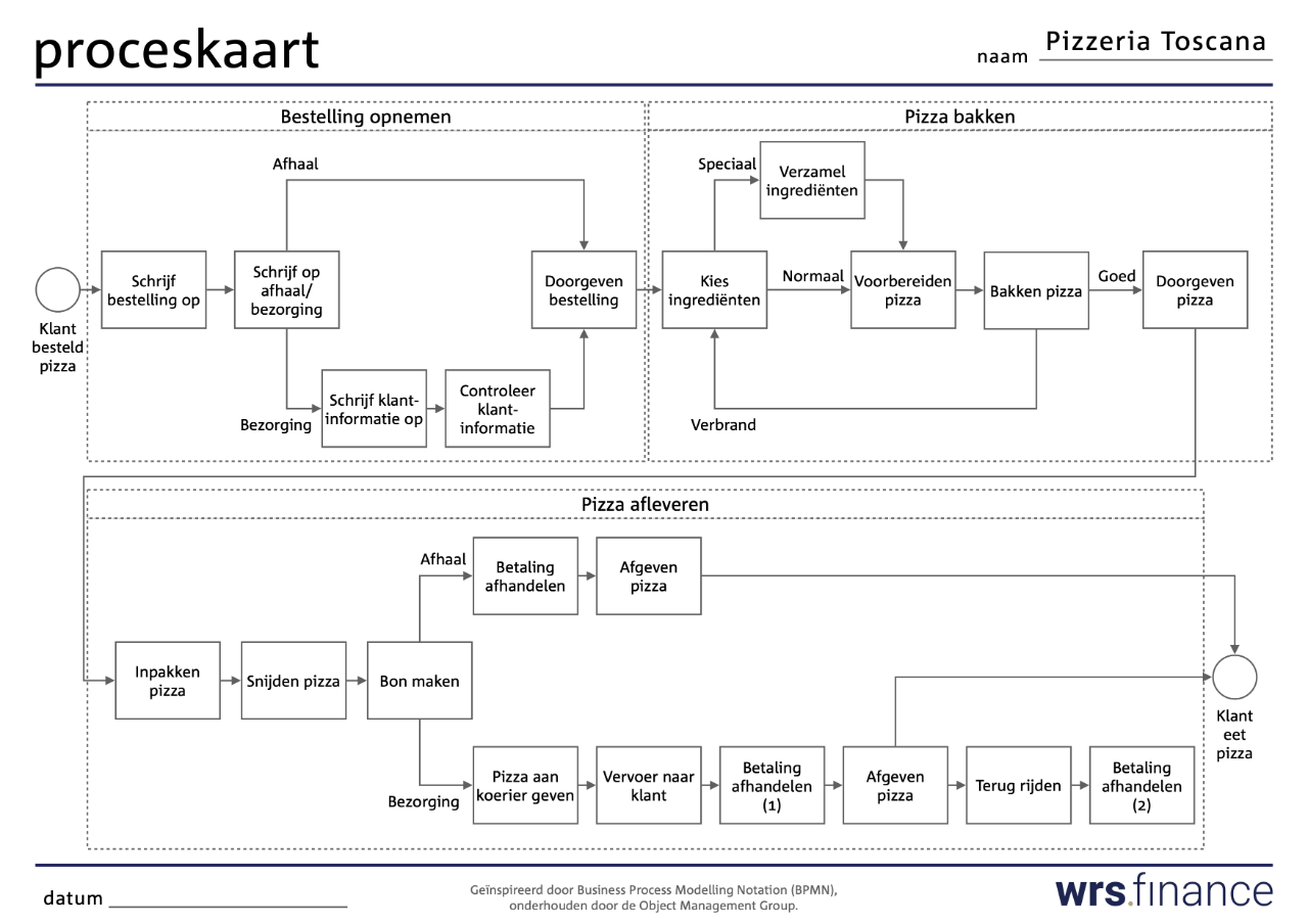 Kijk voor inspiratie naar de Proceskaart van Pizzeria Toscana om te zien hoe een proces wordt weergegeven met de Proceskaart.